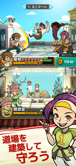 影の牙のギャングたちが道場がある地区で大暴れしている。彼らと戦って道場を守れるかどうかは君の活躍にかかっている!タップして道場に投資してアイドリング時の利益を増やそう。さらにタップし続けて道場を拡大して部屋を増やし、カンフーと空手を学ぶ弟子を鍛えて格闘技の達人を雇用しよう。道場を再建して以前の栄光を取り戻し、他のカンフークランと戦ってランキングの上位を目指し、誉れ高き黒帯を獲得しよう。