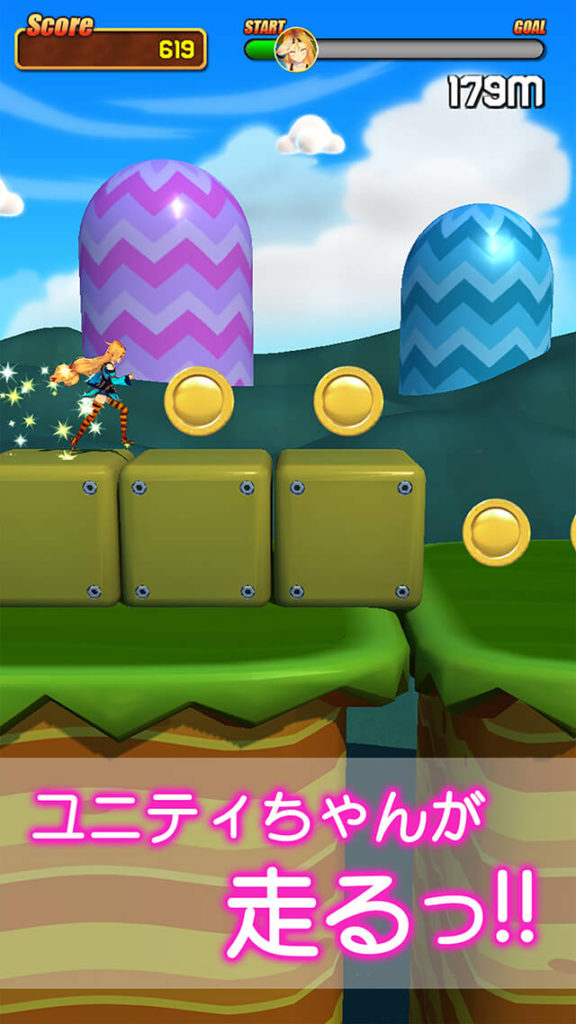 疾走するユニティちゃんを、「上フリックでジャンプ」し、崖を飛び越え、「下フリックでスライディング」し狭いステージをくぐり抜け、コインを集めながらゴールを目指します。