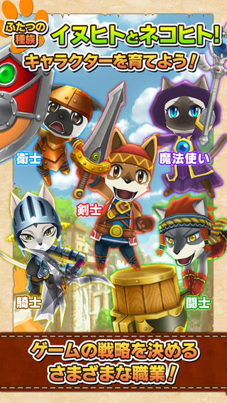 「イヌヒト」と「ネコヒト」と呼ばれるキャラクターが、未開の地を冒険する王道ファンタジーRPG。簡単操作で誰でも大冒険を楽しむことができます。キャラクターはすべて3Dモデルによって愛らしく表現されており、装備を変更するとすべて見た目にも反映されます。