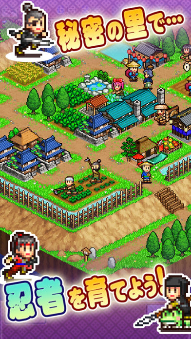 忍びの里を育てて、天下統一をめざすシミュレーションです。忍びの里では村人(実は忍者)たちが作った商品や、里から採れる材木や鉱石を、村に訪れる旅人に売ってお金を稼いでいます。