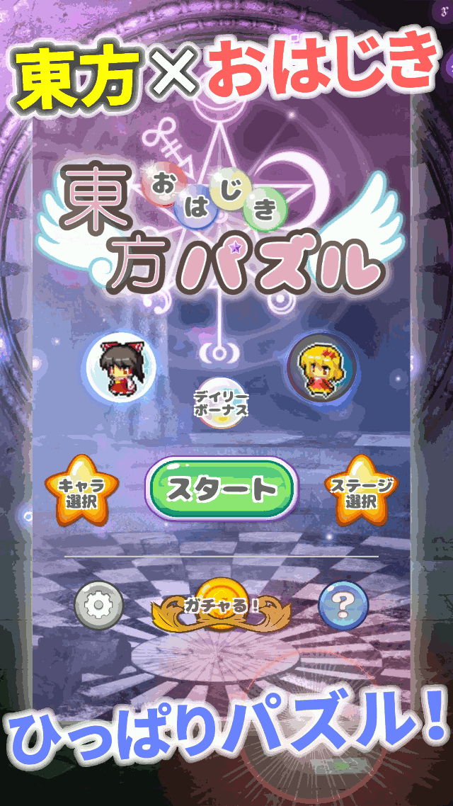 ステージクリア型のお手軽ひっぱりパズル!ガチャで可愛い東方キャラ達をゲットしよう。