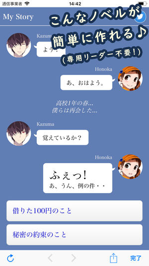 箱庭ノベルズは、テキストや画像表示に加え、アイコンを使ったチャット、選択肢による分岐等も演出できる、ノベルゲームライクな作品を制作・公開できるサービスです。