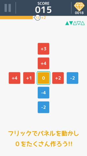 上下左右フリックで数字パネルを動かし、中心パネルに「0」を作ろう!